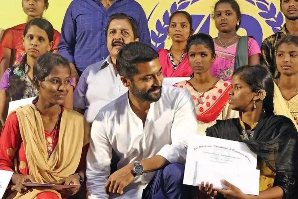அகரம் என்ற அறக்கட்டளையை நிறுவி ஏழை மாணவர்களின் கல்விக்கு அவர் உதவி வருகிறார்.
