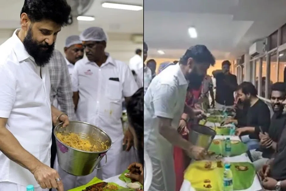 படக்குழுவினருக்கு விருந்து பரிமாறும் நடிகர் விக்ரம். - படங்கள்: ஊடகம்