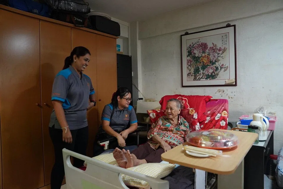 சன்லவ் இல்லத் தாதியரான ஜே அர்ச்சனா (இடது), கடந்த ஐந்து மாதங்களாக வாரத்திற்கு இருமுறை திருவாட்டி சுங்கைக் காணச் செல்கிறார்.