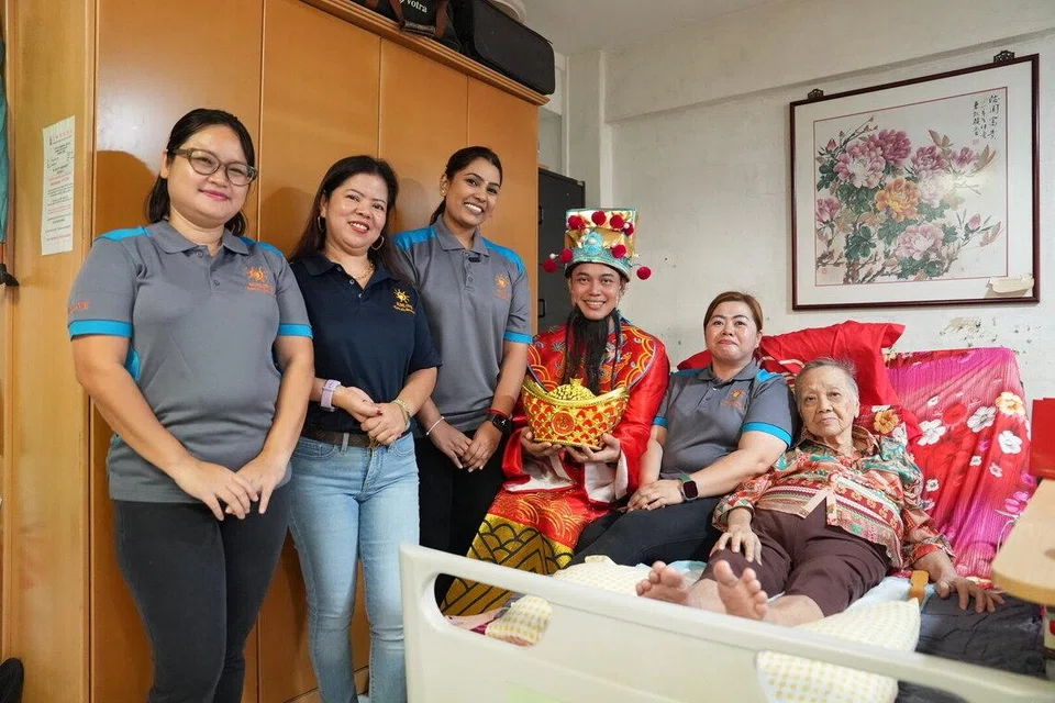 சன்லவ் இல்லப் பணியாளர்களுடனும் மகளுடனும் சீனப் புத்தாண்டை 87 வயது சுங் வாய் ஃபாங் புன்னகையுடன் வரவேற்றார். - படம்: செய்யது இப்ராகிம்