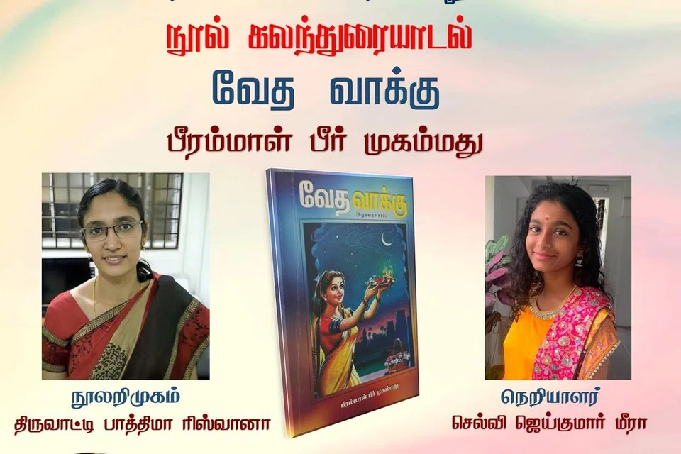 உள்ளூர்ப் படைப்புகளைப் பற்றித் தெரிந்துகொள்ள நடைபெறும் நூல் கலந்துரையாடல் அங்கத்தில், திருவாட்டி பாத்திமா ரிஸ்வானா, எழுத்தாளர் பீரம்மாள் பீர் முகம்மதின் ‘வேத வாக்கு’ நூலைப் பற்றிய அறிமுகத்தை வழங்குவார்.