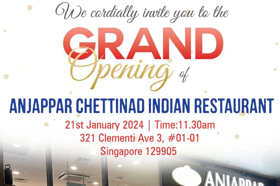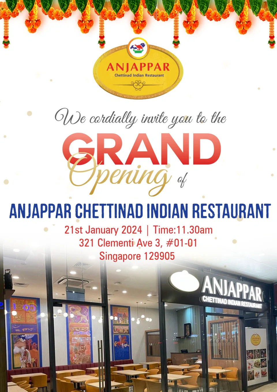 சிங்கப்பூரில் பிரபல இந்திய அசைவ உணவகங்களில் ஒன்றான அஞ்சப்பர் செட்டிநாடு, கிளமென்டியில் தனது புதிய கிளையை ஜனவரி 21ஆம் தேதி திறக்கவுள்ளது
