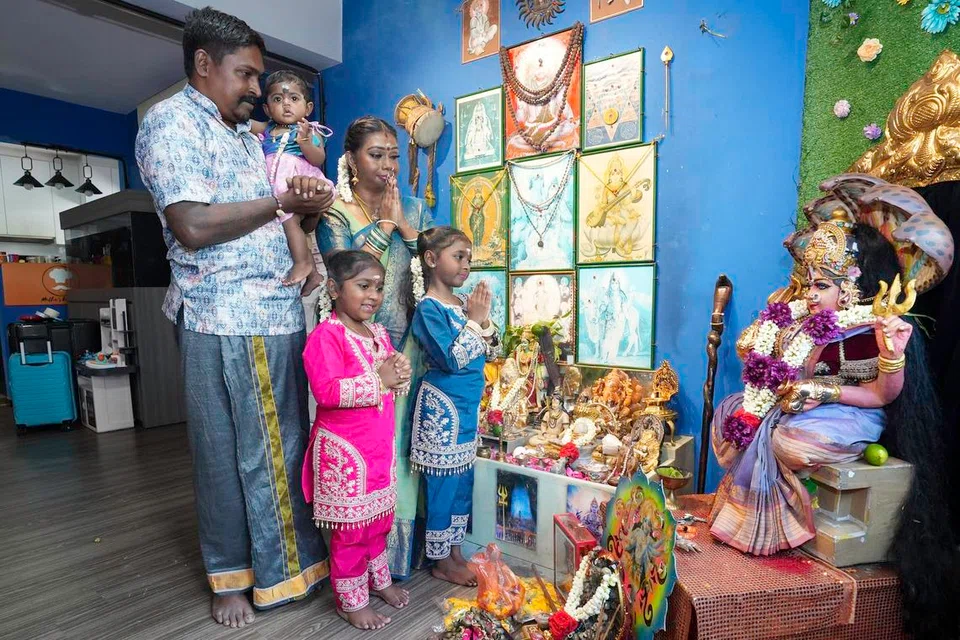 புத்தாடை அணிந்து பொழுது புலரும் வேளையில் இறைவனை மலர்களால் வழிபட்டுத் சித்திரைப் புத்தாண்டை வரவேற்கின்றனர் கனகேஷ்வரி - முத்துக்குமரன் குடும்பத்தினர்.