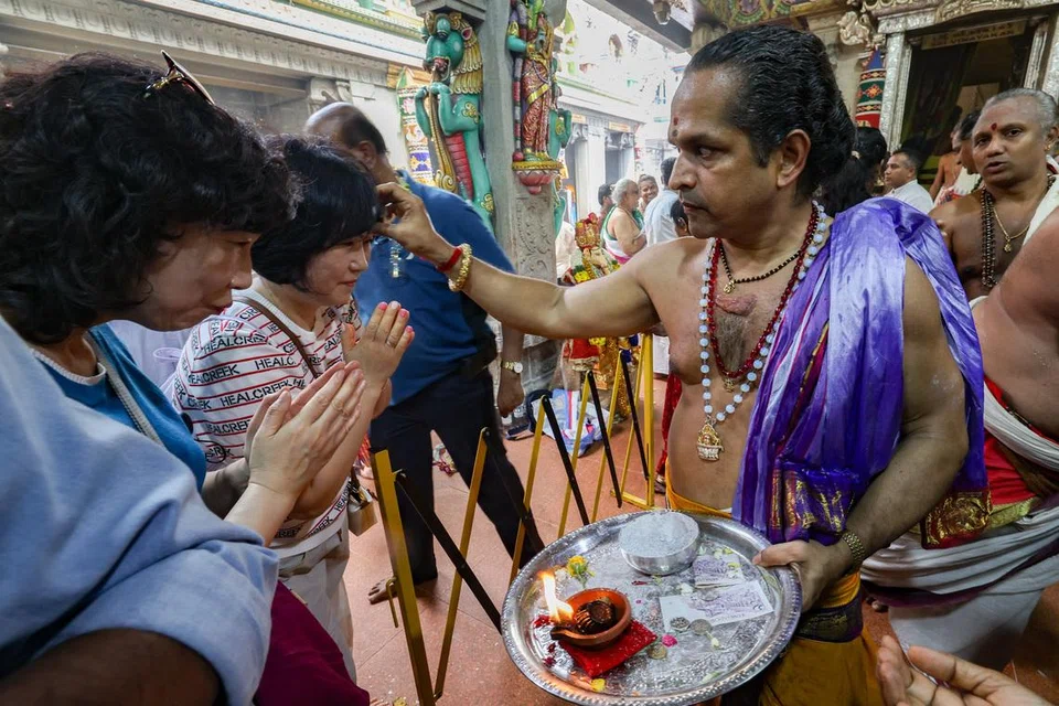 சீன பக்தர்களுக்குத் திருநீறு அளிக்கும் அர்ச்சகர். - படம்: த.கவி
