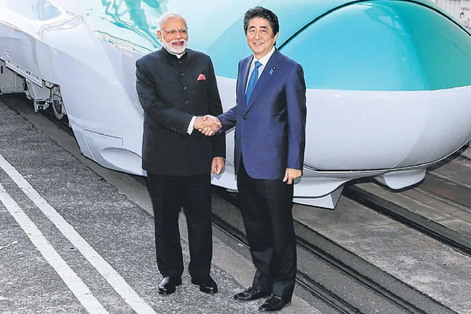2017ல் ஜப்பானிய பிரதமர் ஷின்சோ அபேயும் பிரதமர் மோடியும் சந்தித்து புல்லட் ரயிலில் பயணம் செய்தபோது புதிய ரயில் திட்டத்தை அறிவித்தனர். கோப்புப் படம்: ஏஎஃப்பி