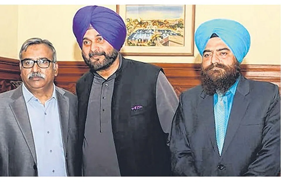 பாகிஸ்தானில் நடைபெற்ற விழாவில் காலிஸ்தான் தலைவர் கோபால் சிங் சாவ்லாவுடன் (வலது) புகைப்படம் எடுத்துக்கொண்ட காங்கிரஸ் கட்சியின் நவ்ஜோத் சிங் சித்து (நடுவில்). படம்: இந்திய ஊடகம்