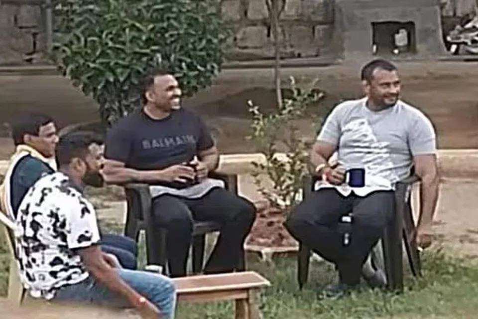 ஒரு கையில் பானக் குவளை, இன்னொரு கையில் சிகரெட்டுடன் நாற்காலியில் அமர்ந்தபடி, மேலும் மூவருடன் தர்ஷன் பேசிக்கொண்டிருப்பதை இணையத்தில் வெளியான புகைப்படம் காட்டுகிறது. குற்றவாளி வில்சன் கார்டன் நாகா, தர்ஷனின் மேலாளர் நாகராஜ், இன்னொரு சிறைவாசியான குள்ள சீனா ஆகியோரே மற்ற மூவர் எனத் தகவல்கள் கூறுகின்றன.