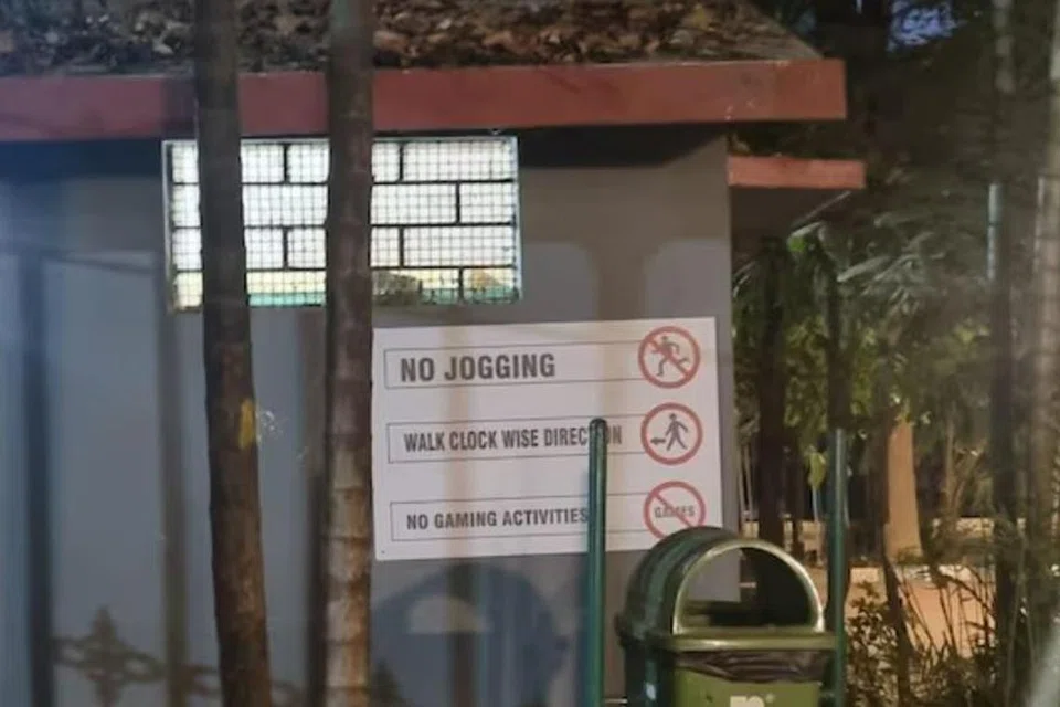 ‘மெதுவோட்டம் கூடாது’, ‘கடிகைச் சுற்றாக நடக்கவும்’, ‘விளையாட்டு நடவடிக்கைகள் அனுமதிக்கப்படா’ போன்ற விதிகளைக் கொண்ட பலகையைப் படம் பிடித்து எக்ஸ் தளத்தில் பகிர்ந்தார் அந்தப் பெண்.