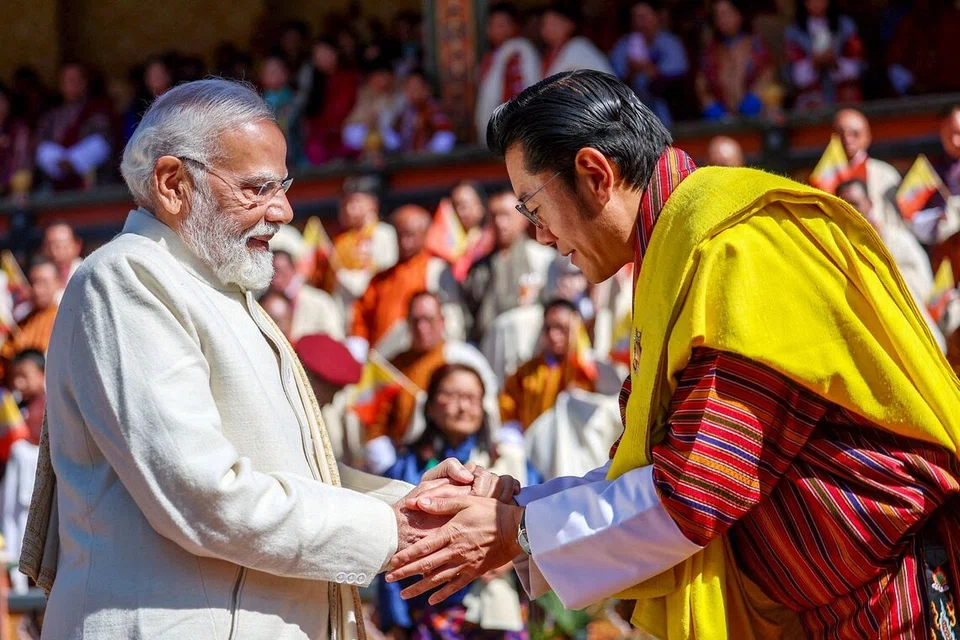 பூட்டானுக்கு இரண்டு நாள் அரசுமுறைப் பயணமாக செவ்வாய்க்கிழமை சென்ற பிரதமர் மோடி, தலைநகர் திம்புவில் அந்நாட்டின் மன்னர் ஜிக்மே கெசர் நாக்யெல் வாங்சுக்கை சந்தித்துப் பேசினார்.