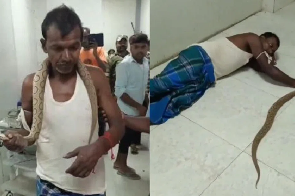 பிரகாஷ் மண்டல் என்ற அந்த ஆடவர், அப்பாம்பின் வாயை இறுகப் பிடித்தபடி, அதனைத் தன் கழுத்தில் போட்டுக்கொண்டு மருத்துவமனைக்குச் சென்றார்.