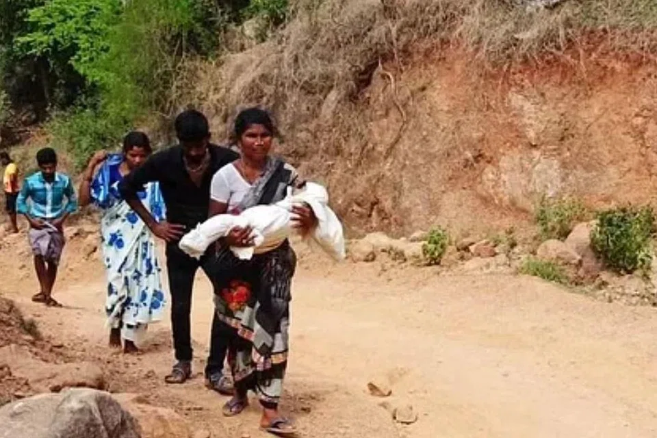 அவசர உதவி வாகனம் சாலையில் செல்ல முடியாததால் கிட்டத்தட்ட 10 கிலோமீட்டர் தூரம் மாண்ட குழந்தையை பெற்றோர் வீட்டுக்கு கொண்டு சென்றனர்.
