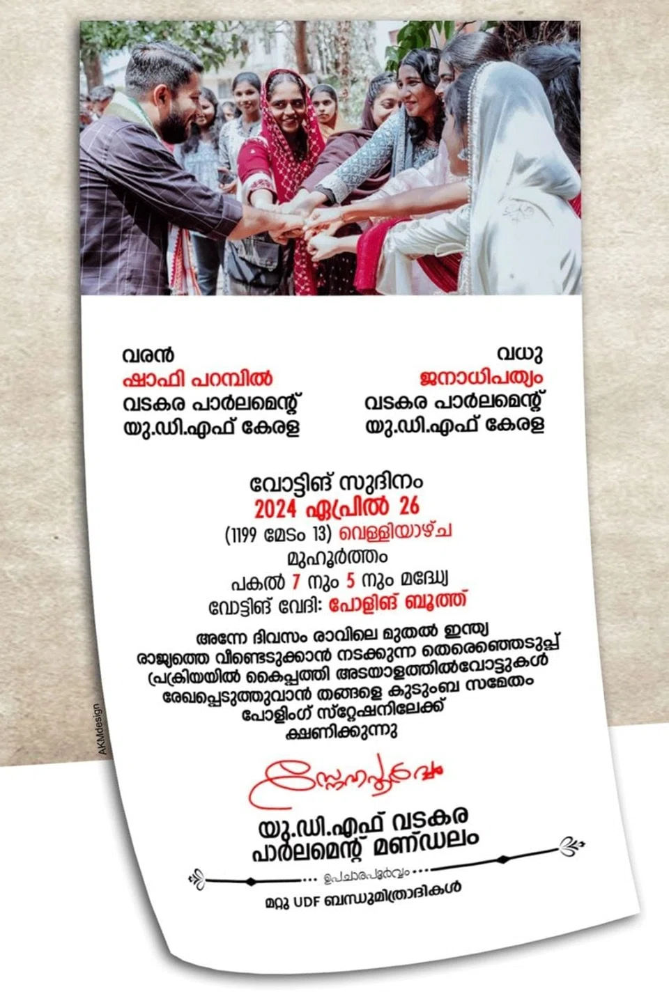 “இந்தியாவை மீட்க தங்கள் குடும்பத்தோடு வாக்குச்சாவடிக்கு வந்து ‘கை’ சின்னத்தில் வாக்குகளைப் பதிவுசெய்ய தங்களை வரவேற்கிறோம்,” என்று ‘அழைப்பிதழில்’ கூறப்பட்டுள்ளது. அதன் மேற்பகுதியில் ஷஃபி வாக்கு சேகரிக்கும் படமும் இடம்பெற்றுள்ளது.