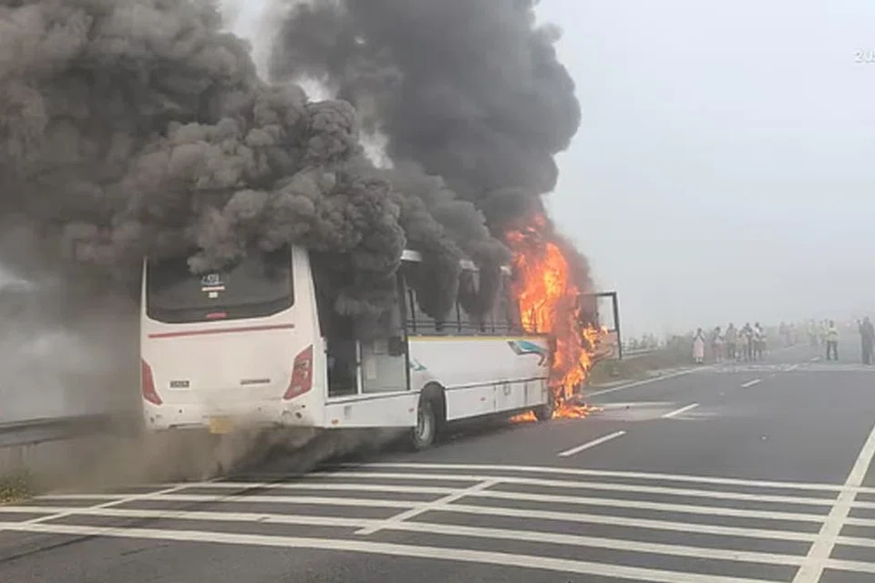 இதில் பேருந்தும் இருசக்கர வாகனமும் முழுமையாக எரிந்து சாம்பலாகின.