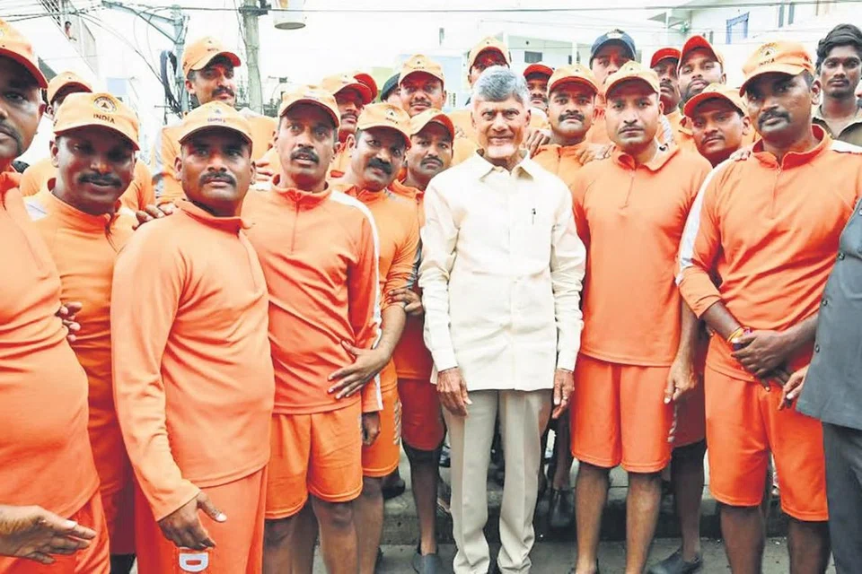 தேசியப் பேரிடர் மேலாண்மை ஆணையத்தின் மீட்புப் பணியாளர்களுடன் ஆந்திர முதல்வர் சந்திரபாபு நாயுடு. - படம்: ஊடகம்