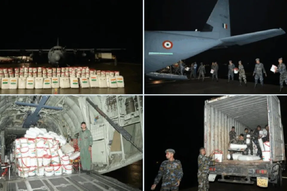 “80 டன் நிவாரணப் பொருள்கள் அனுப்பி வைக்கப்பட்டுள்ளன. நிவாரணப்பொருள்களில் உணவுப் பொட்டலங்கள், மருத்துவக் கருவிகள், குடிநீர் சுத்திகரிப்பு மருந்துகள், உடமைகளைப் பாதுகாப்பதற்கானத் தார்ப்பாய்கள் உள்ளிட்ட அவசரத் தேவைகளுக்கான நிவாரணப் பொருள்களுடன் சாப்பிடத் தயாராக உள்ள உணவுப் பொருள்களையும் ஏற்றிச் சென்ற இந்திய விமானப்படையின் C-130 J விமானம் கொழும்பில் தரையிறங்கியுள்ளது,” என்று பதிவிட்டுள்ளார்.