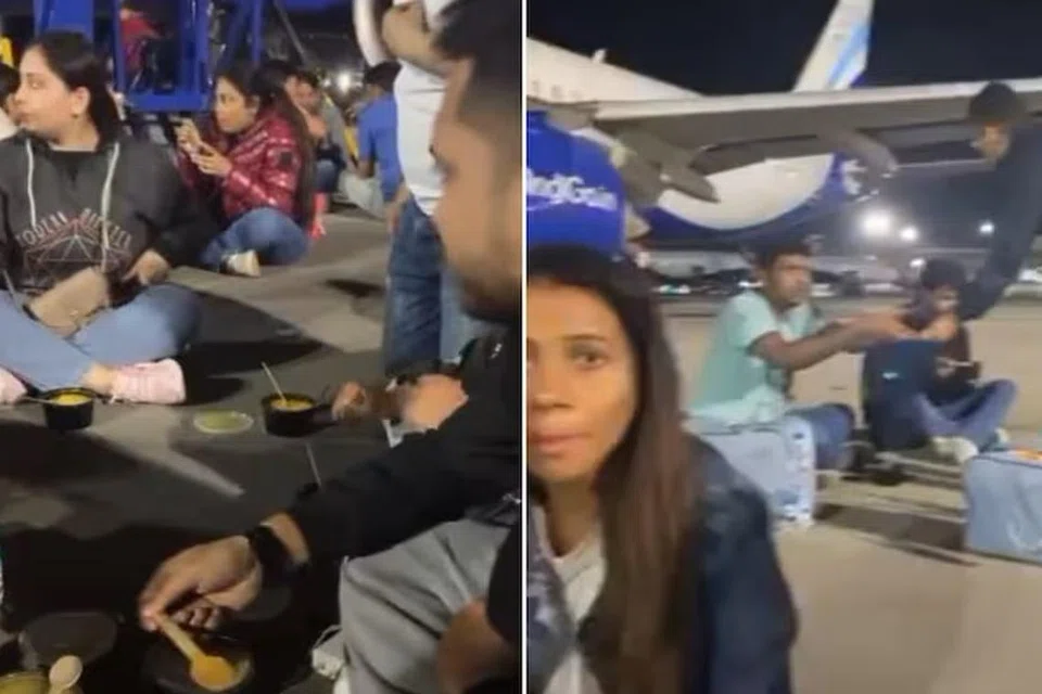 விமானம் வானில் பறக்க தாமதமான நிலையில், விமானத்தைவிட்டுக் கீழே இறங்கிய பயணிகள், தார்ச்சாலையிலேயே அமர்ந்து உண்ட காணொளி அண்மையில் இணையத்தில் பரவலானது.