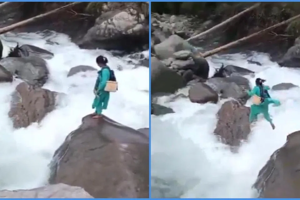 ஆறு அதிகளவிலான நீரால் நிரம்பி, வேகமாகப் பாய்ந்து ஓடும் நிலையில் அதற்கு நடுவே ஆங்காங்கே பாறைகள் இருப்பதைக் காணொளி காட்டியது.