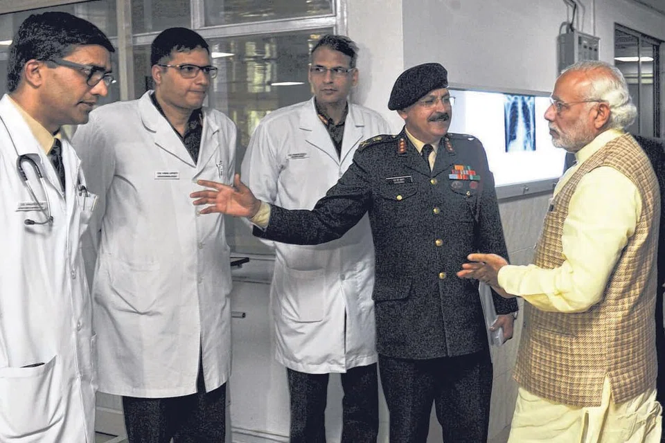 சியாச்சினில் மீட்கப்பட்ட வீரரின் உடல்நிலை குறித்து ராணுவ மருத்துவமனை மருத்துவர்களிடம் விசாரித்து அறிகிறார் பிரதமர் மோடி. படம்: ஊடகம்
