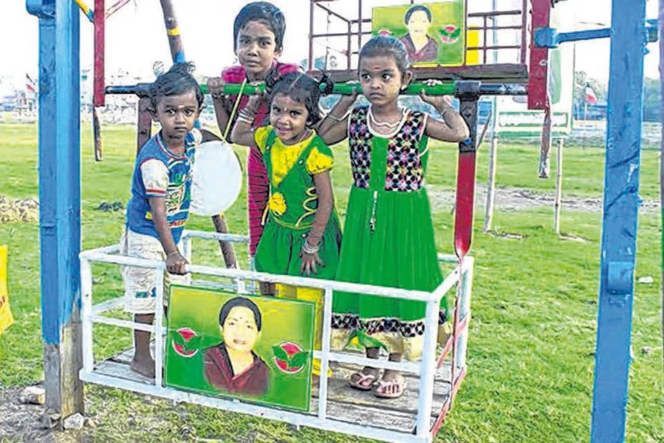 இந்நிலையில், குழந்தைகளிட மும் ஜெயலலிதாவுக்கு பெயர் வாங்கிக் கொடுக்க அதிமுகவின ரும் அரசு அதிகாரிகளும் முடிவு செய்துவிட்டனர் போலிருக்கிறது. மாநிலம் முழுவதும் உள்ள குழந்தைகளுக்கான பூங்காக்களில் நிறுவப்பட்டுள்ள விளையாட்டு சாதனங்களிலும் முதல்வர் ஜெய லலிதாவின் படங்கள் ஒட்டப் பட்டுள்ளன. இதுவும் சர்ச்சைக்கு உள்ளாகும் எனத் தெரிகிறது. படம்: தமிழக ஊடகம்