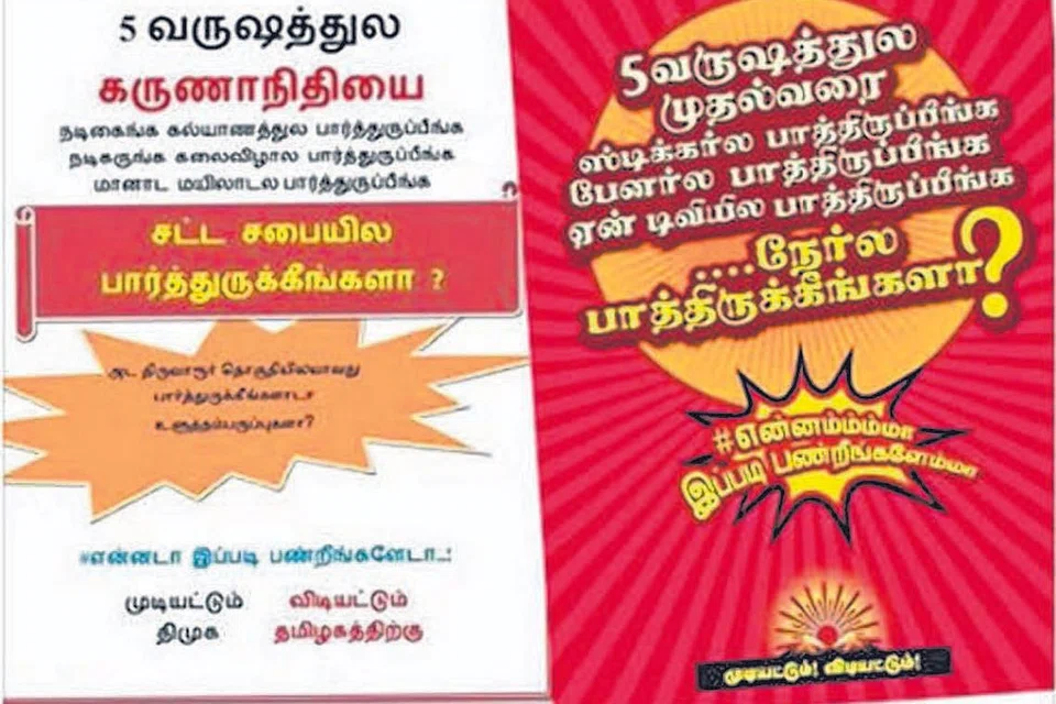 இந்த சந்தேகத்தை மேலும் கிளப்பிவிடும் வகையில் இரண்டு கட்சிகளும் புதிய பாணி விளம் பர உத்தியை, பிரசாரங்களை முன்னதாகவே தொடங்கி இருக்கின்றன. எடுத்த எடுப்பிலேயே தலை வர்களைப் பார்த்தீர்களா? என்று இரண்டு தரப்புகளும் வாக்காளர் களைக் கேட்டு விளம்பரம், சுவ ரொட்டிப் போரை கிளப்பியுள்ளன. இதிலும் திமுக முந்திக் கொண்டது என்றாலும் அதற்கு அதிமுக சரியான பதிலடியைக் கொடுத்து வருகிறது. இந்தப் புதிய பாணி விளம்பரப் பிரசாரப் போரில், தன் பங்காக கடந்த ஐந்து ஆண்டுகளில் முதல்வரும் அதிமுக தலைவியு மான ஜெயலலிதாவை நேரே பார்த்ததுண்டா என்று வாக்காளர் களைத் திமுக கேட்டுள்ளது.