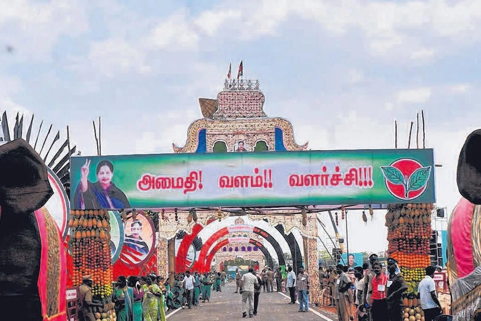 அதிமுக பொதுச்செயலரும் முதல்வருமான ஜெயலலிதா தீவிர பிரசாரம் மேற்கொண்டுள்ளார். அவர் பங்கேற்கும் பொதுக்கூட்டங்களுக்காக அதிமுகவினர் பிரமாண்ட ஏற்பாடுகளைச் செய்து வருகின்றனர். நூறடி உயர பதாகைகள், அலங்கார வரவேற்பு வளைவுகள் அமைக்கப்படுகின்றன. தொண்டர்களுக்கு அதிமுக சின்னம், ஜெயலலிதா உருவம் பதித்த தொப்பிகள் வழங்கப்படுகின்றன. படம்: சதீஷ்