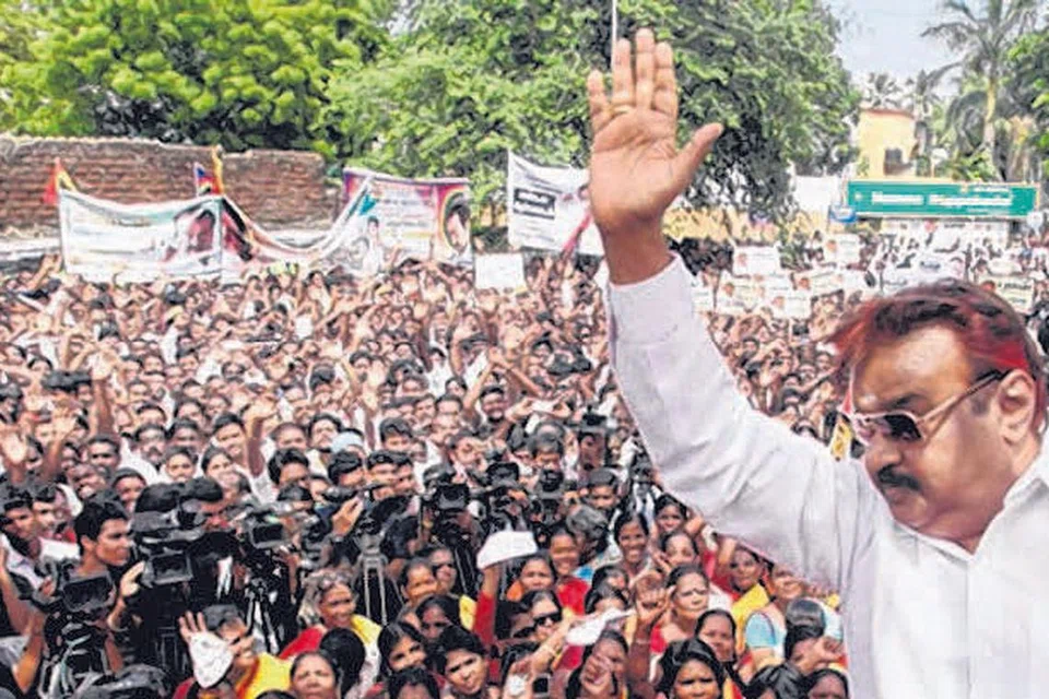 பிரசாரக் கூட்டம் ஒன்றில் உற்சாகமாக விஜயகாந்த். படம்: ஊடகம்