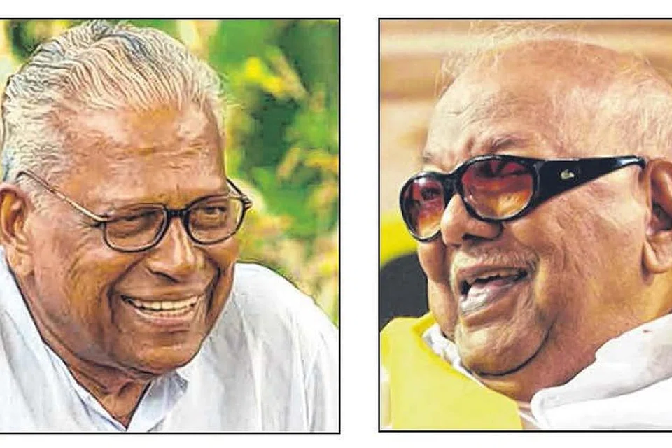 93 வயதான வி.எஸ்.அச்சுதானந்தன், திமுக தலைவர் கருணாநிதி.