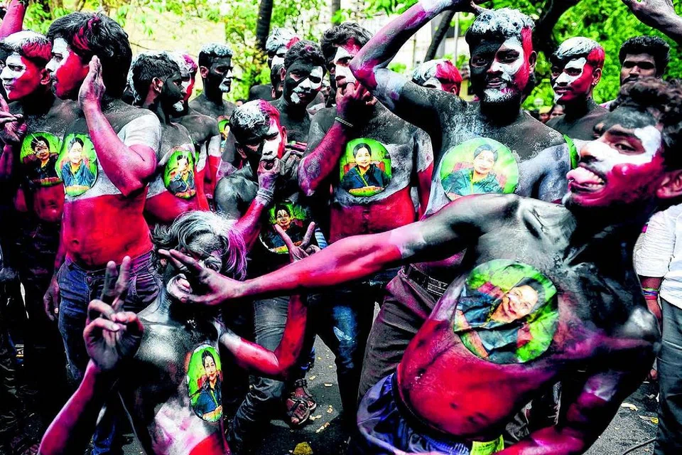 இதையடுத்து இளையர் மற்றும் மாணவரணியைச் சேர்ந்தவர்கள் உடல் முழுவதும் அதிமுக கொடியைப் போன்று வர்ணம் பூசிக் கொண்டு, முதல்வர் ஜெயலலிதாவின் உருவம் கொண்ட ஸ்டிக்கருடன் உற்சாக ஆட்டம் போடத் தொடங்கினர். இவர்களுக்குப் போட்டியாக அதிமுக மகளிரணியினரும் நடனமாடியதால், கூடியிருந்தவர்கள் உற்சாகமடைந்தனர். இவர்களுக்கு அதிமுக நிர்வாகிகள் குளிர்பானங்களை விநியோகித்தனர். படம்: ஏஎஃப்பி