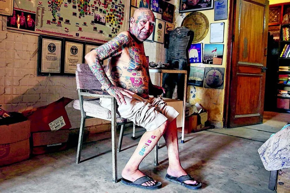 உடல் முழுவதும் 366 நாடுகளின் கொடிகள் இந்தியாவைச் சேர்ந்த ஹர் பர்காஷ் ரிஷி (படம்), வயது 74, தனது உடல் முழுவதும் 366 நாடுகளின் கொடிகளைப் பச்சைக் குத்தி கின்னஸ் சாதனைப் படைத்துள்ளார். அவரது பற்கள் அனைத்தும் அகற்றப்பட்டுள்ளதால் 50 எரியும் மெழுகுவத்திகளை ஒரே சமயத்தில் தனது வாயில் வைத்து சாகசம் செய்து காட்டுகிறார். இருபதுக்கும் மேற்பட்ட உலகச் சாதனைகளை கையில் வைத்திருக்கும் இவர், தன்னை 'கின்னஸ் ரிஷி' என்றே அழைத்துக்கொள்கிறார்.