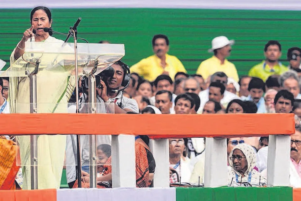 கோல்கத்தா: இந்தியாவில் பாரதிய ஜனதா கட்சி அரசு பசு மாட்டை வைத்து அரசியல் செய்வதாக மம்தா பானர்ஜி சாடியுள்ளார். "நாட்டு மக்களைப் பிரித்தாளும் அரசியலை ஒரு போதும் பொறுத் துக்கொள்ள முடியாது," என்று மத்திய அரசுக்கு எச்சரிக்கை விடுத்துள்ளார் மேற்கு வங்க முதல்வர் மம்தா பானர்ஜி. ஆட்சிக்கு வந்த போது பேசிய மம்தா, "காவி பாகுபாட்டு அரசியல்" குறித்துக் கடு மையாக விமர்சித்தார். இப்போது தியாகிகள் நாளை யொட்டி கோல்கத்தாவில் மிகப் பெரிய பேரணியில் மம்தா "பசு அரசியலை நிறுத்துமாறு பாஜக அரசுக்கு வேண்டுகோள் வைத்துள் ளார்.