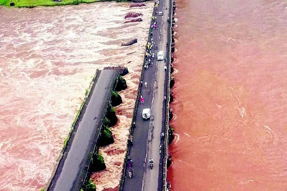 இந்தியாவின் மும்பை அருகே ஆற்றுப் பாலம் உடைந்து விழுந்த தில் 2 பேர் மாண்டனர். இரண்டு பேருந்துகள் ஆற்று நீரில் அடித்துச் செல்லப்பட்டதில் அவற்றில் பயணம் செய்த 20 பேரின் கதி என்னவென்று தெரியவில்லை. மும்பை=கோவா விரைவுச் சாலையில் மஹாத் நகர் அருகே சாவித்திரி ஆறு ஓடுகிறது. அந்த ஆற்றின் மேல் இருவழிப் போக்கு வரத்துக்காக இரு பாலங்கள் உள்ளன. அவற்றில் ஒன்று பிரிட் டிஷ் ஆட்சிக் காலத்தில் கிட்டத் தட்ட எழுபது ஆண்டுகளுக்கு முன்னால் கட்டப்பட்டது. கடின மழை பெய்ததைத் தொடர்ந்து நேற்று முன்தினம் இரவு 11.30 மணியளவில் அந்தப் பழைய பாலம் திடீர் என இடிந்து விழுந்தது. அப்போது அந்த மேம் பாலத்தில் பயணம் செய்து கொண்டிருந்த அரசுப் பேருந்து கள் இரண்டு அப்படியே ஆற்றில் விழுந்தன. அந்தப் பேருந்துகளில் இருந்த 22 பேரும் பேருந்துகளோடு ஆற் றில் அடித்துச் செல்லப்பட்டனர்.