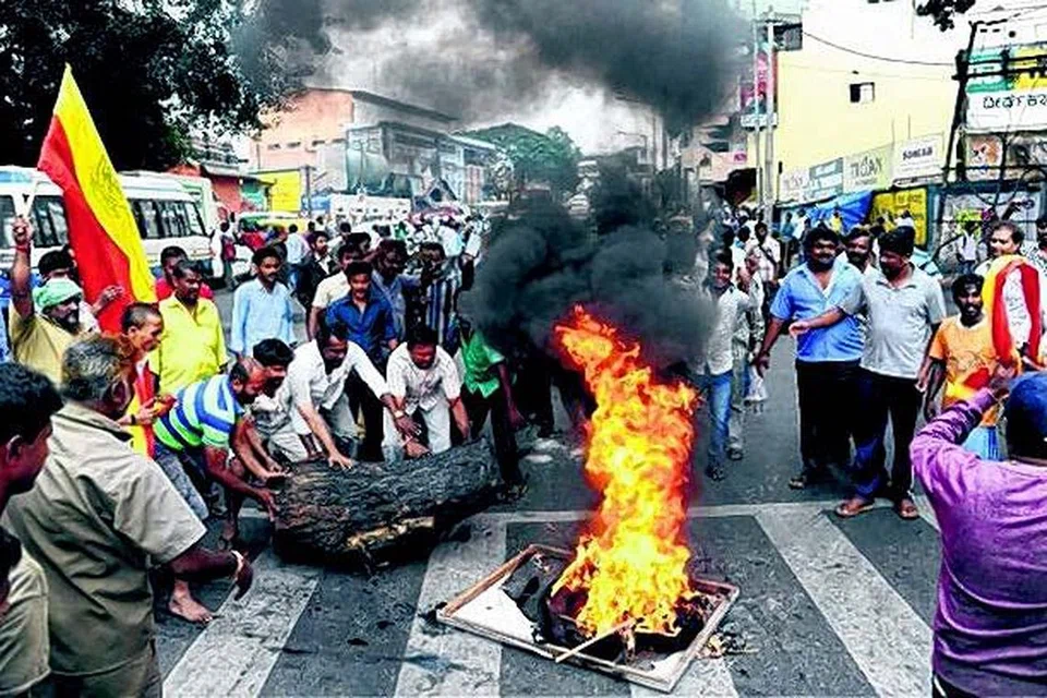 மாண்டியா பகுதியில் மரம் ஒன்றை வெட்டி சாலையில் போட்டு எரித்த காட்சி. படம்: தகவல் ஊடகம்