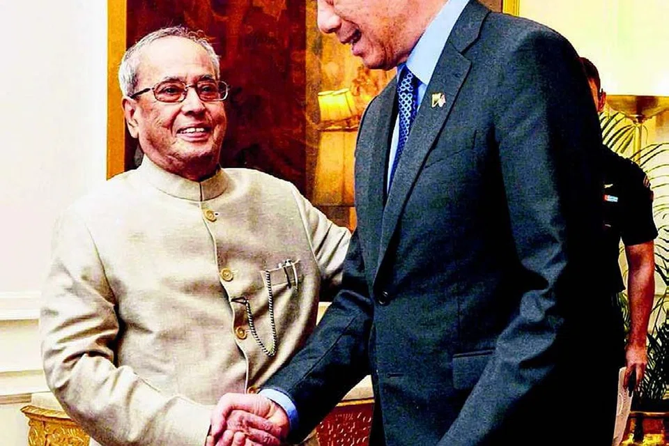 ஐந்து நாள் பயணமாக இந்தியா சென்றுள்ள பிரதமர் லீ சியன் லூங் (வலது), புதுடெல்லியில் உள்ள அதிபரின் அதிகாரபூர்வ இல்லத்தில் இந்திய அதிபர் பிரணாப் முகர்ஜியை நேற்று சந்தித்தார். படம்: ஸ்ட்ரெய்ட்ஸ் டைம்ஸ்