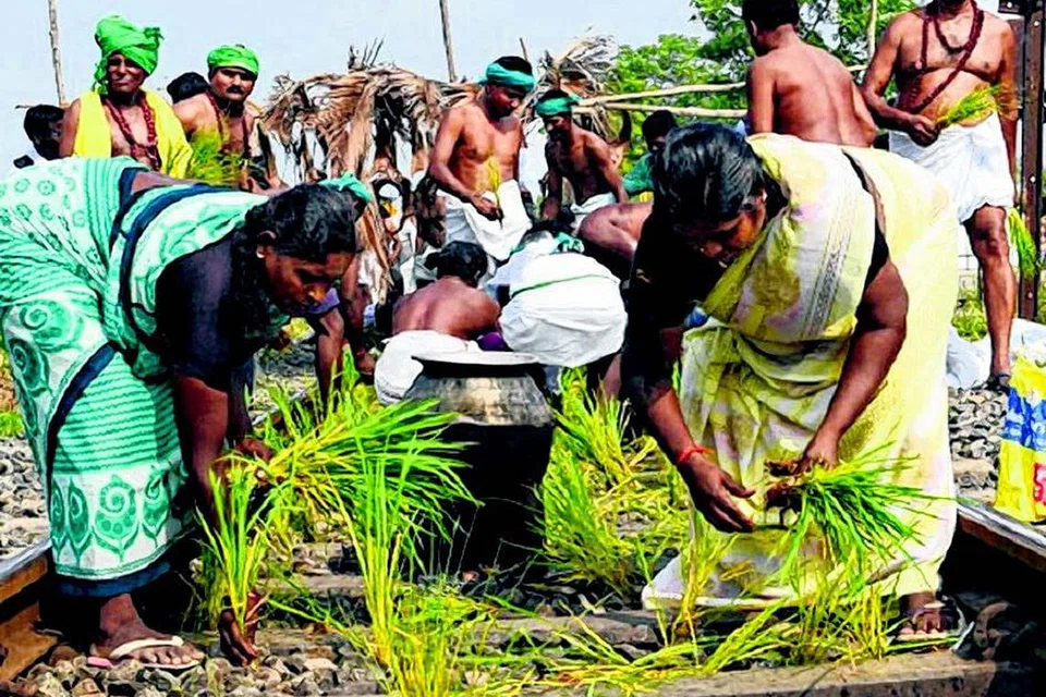 திருச்சி குடமுருட்டி ரயில் நிலையம் அருகே தண்டவாளத்தில் நாற்று நட்டு, அங்கேயே சமைத்து போராட்டத்தில் ஈடுபட்ட விவசாயிகள். படம்: தி இந்து