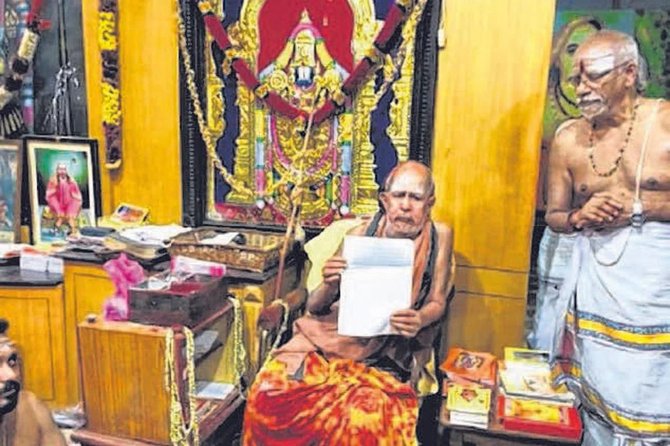 காமாட்சியம்மன் கோயில் கும்பாபிஷேக அறிவிப்பை வெளியிட்ட காஞ்சி சங்கராச்சாரியார் ஜெயேந்திர சரஸ்வதி சுவாமிகள். படம்: தமிழக ஊடகம்