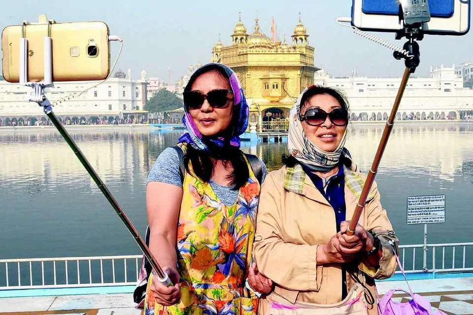 சீக்கிய சமயத்தை நிறுவிய குரு நானக்கின் 547வது பிறந்தநாளைக் சீக்கியர்கள் கொண்டாடும் நேரத்தில், சீக்கியர்களின் புனிதத்தலமான பொற்கோயிலின் முன் 'தம்படம்' எடுத்துக்கொள்ளும் சீன சுற்றுலாப் பயணிகள். படம்: ஏஎஃப்பி