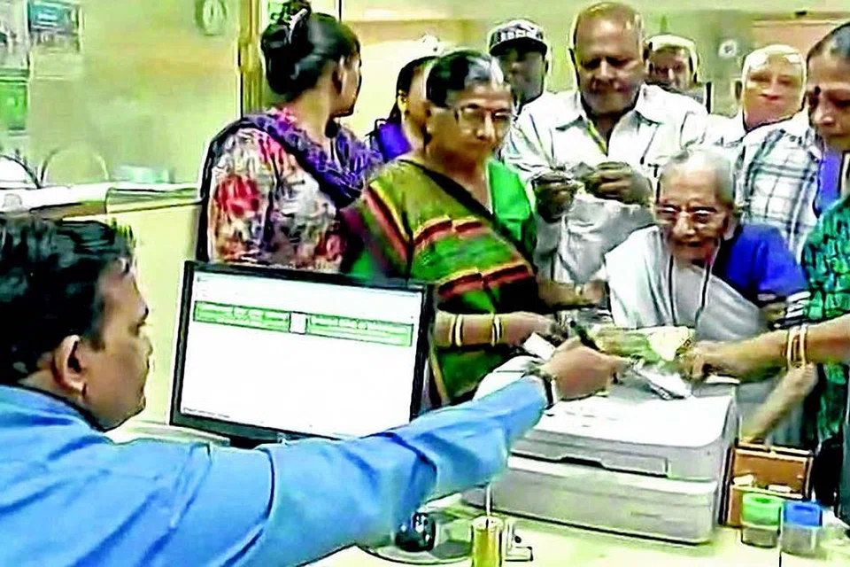 குஜராத் தலைநகர் காந்திநகரில் உள்ள ஒரு வங்கிக்குச் சென்று செல்லாத நோட்டுகளைக் கொடுத்து புதிய நோட்டுகளைப் பெற்றுக்கொண்ட இந்தியப் பிரதமர் மோடியின் தாயார் திருமதி ஹீராபென் (வலமிருந்து 2வது). படம்: இந்திய ஊடகம்