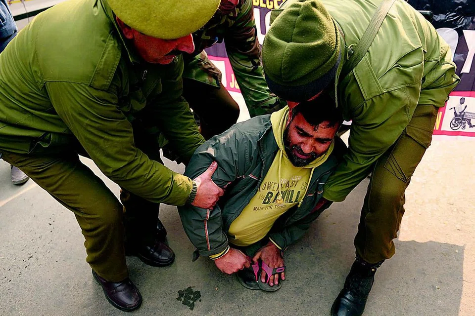 ஆர்ப்பாட்டத்தைக் கைவிட மறுத்த உடற்குறையுள்ள ஆடவரை போலிசார் வலுக்கட்டாயமாக அப்புறப்படுத்தினர். படம்: ஏஎஃப்பி