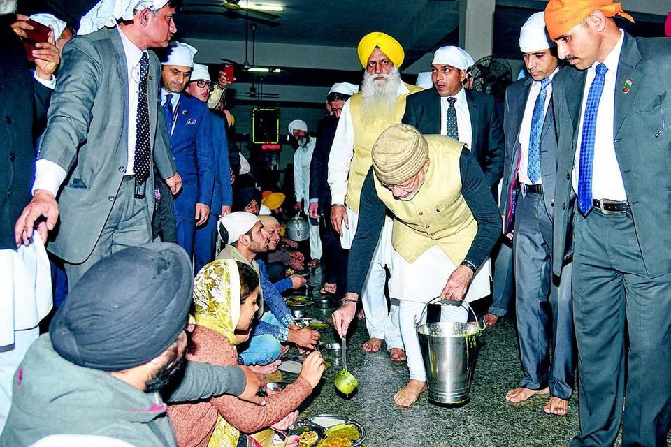 அமிர்தசரஸ் பொற்கோவிலுக்குச் சென்ற பிரதமர் நரேந்திர மோடி, அங்கு இலவசமாக வழங்கப்படும் சைவ உணவை தன் கையால் பலருக்கு பரிமாறினார். படம்: ஏஎப்பி