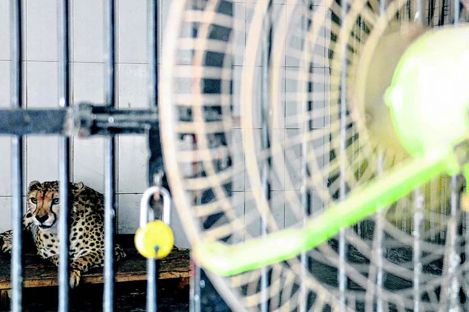 கட்டாந்தரையில் முட்டை பொரிப்பது, மீன் வறுப்பது என்று இணையவாசிகள் வெயிலின் கொடுமையைப் பகிர்ந்து கொள்ளும் அளவுக்கு இந்தியா வின் பல்வேறு பகுதிகளில் வெப்பநிலை 40 டிகிரி செல்சியஸைத் தாண்டியுள்ளது. தெலுங்கானாவில் உள்ள நேரு விலங்கியல் தோட்டத்தில் உள்ள விலங்குகளை வெயிலின் தாக்கத்தில் இருந்து பாதுகாப் பதற்கு விலங்கியல் தோட்டத்தில் பல்வேறு மாற்று ஏற்பாடுகள் செய்யப்பட்டுள்ளன. கூண்டு களுக்கு அருகே மின்விசிறிகள் அமைப்பது, அவ்வப்போது விலங்குகளின் மீது நீரைப் பாய்ச்சி அடிப்பது போன்ற செயல்களை விலங்கியல் தோட்ட ஊழியர்கள் மேற்கொண்டு வருகின்றனர். படம்: ஏஎஃப்பி