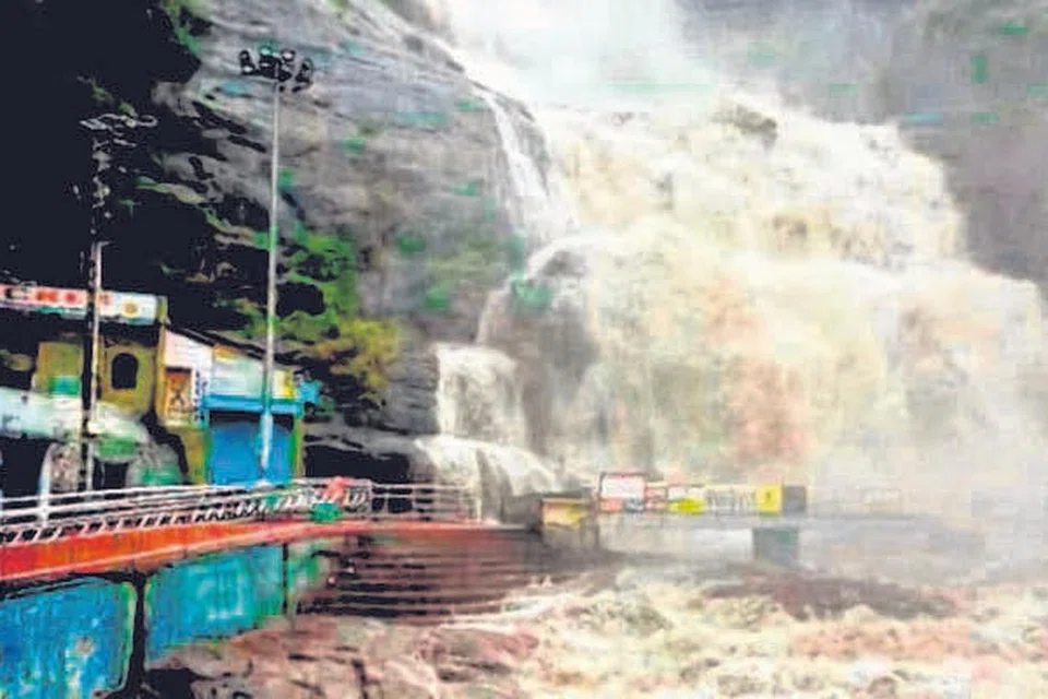 குற்றாலத்தில் முக்கிய அருவியை நெருங்கவிடாமல் கொட்டும் வெள்ளம். படம்: தமிழக தகவல் சாதனம்