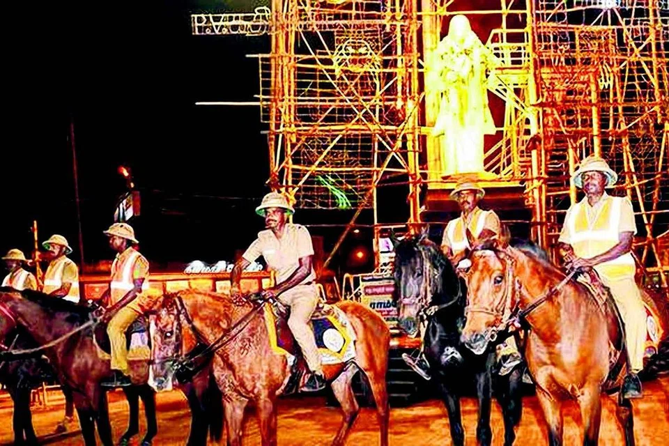 பசும்பொன் பகுதியில் முத்துராமலிங்க தேவர் சிலை முன்பு பாதுகாப்புப் பணியில் ஈடுபடுத்தப்பட்டுள்ள போலிசார் இரவு பகல் பாராமல் விழிப்புடன் செயல்படுகின்றனர். படம்: தகவல் ஊடகம்