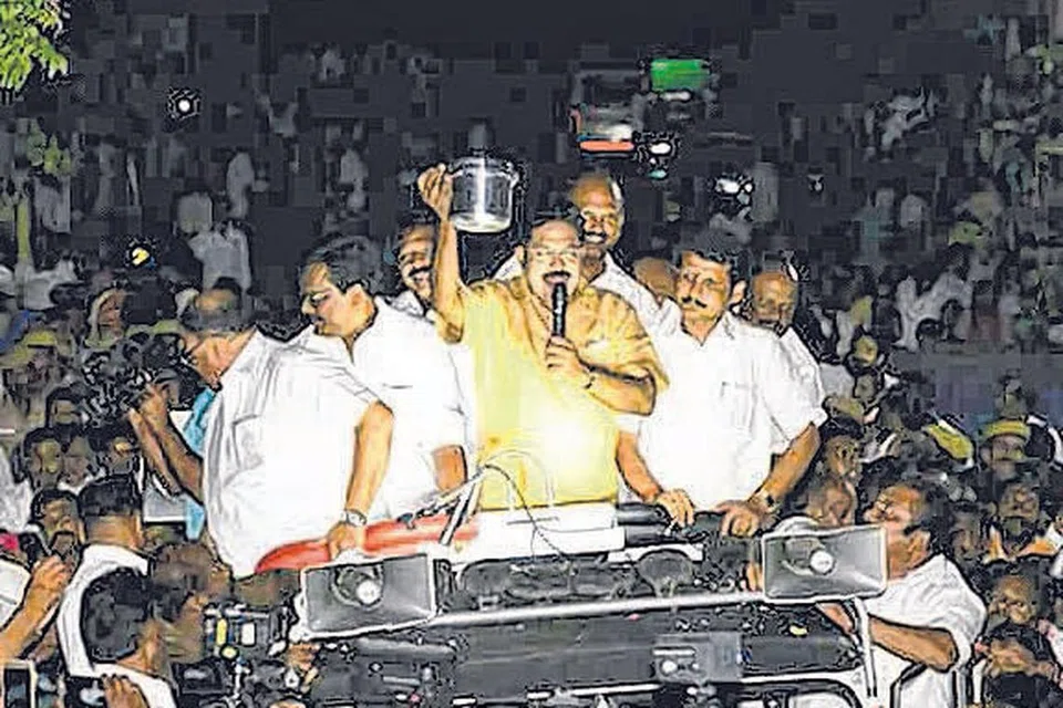 தனக்கு வழங்கப்பட்ட சின்னமான குக்கருடன் ஆர்கே நகரில் தீவிர பிரசாரத்தில் ஈடுபட்டுள்ளார் தினகரன். படம்: தகவல் ஊடகம்