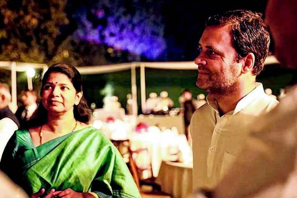 சோனியா காந்தி அளித்த விருந்தில் காங்கிரஸ் கட்சித் தலைவர் ராகுல் காந்தியுடன் (வலது) திமுக நாடாளுமன்ற மேலவை உறுப்பினர் கனிமொழி. படம் இந்திய: ஊடகம்