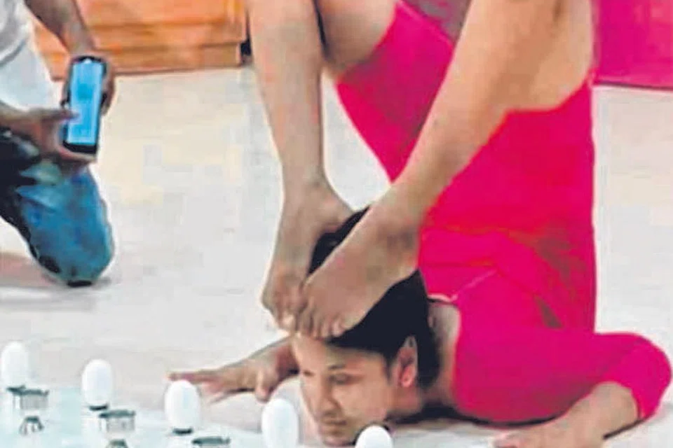 மேலும் தாடையை தரையில் ஊன்றி 7 நிமிடங்கள் யோகாச னம் செய்தும் அசத்தினார். இதன் மூலம் முந்தைய சாத னையை அவர் தகர்த்துள்ளார். மார்புப் பகுதியை இறுக்கி, பாதத்தைப் பயன்படுத்தி 18.28 வினாடி நேரத்தில் முட்டைகளை குடுவையில் வைத்து மற்றொரு கின்னஸ் சாதனையையும் படைத்துள்ளார் வைஷ்ணவி. படம்: தமிழக ஊடகம்
