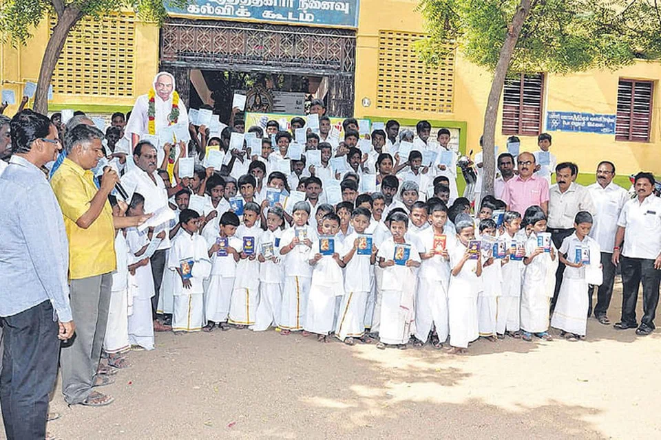 அந்த வகையில், கோவில்பட்டி பள்ளியில் தமிழ்மன்றத்தின் சார்பில் கல்வி வளர்ச்சி நாள் விழா கொண்டாடப்பட்டது. மொத்தம் 90 மாணவர்கள், 26 மாணவிகள் என மொத்தம் 116 பேர் காமராஜர் போல, வேட்டி, சட்டை, துண்டு அணிந்து, தலையில் காமராஜர் உருவம் பொறிக்கப்பட்ட அட்டையிலான தொப்பியும் அணிந்து விழாவில் பங்கேற்றனர். படம்: தமிழக தகவல் ஊடகம்