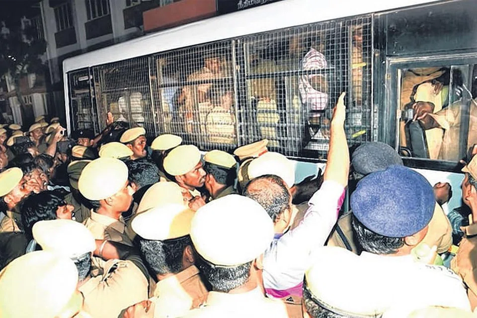 சென்னை உயர் நீதிமன்றத்திலிருந்து போலிஸ் வாகனத்தில் வெளியே கொண்டுவரப்பட்ட குற்றவாளி களை வழக்கறிஞர்கள் சுற்றிவளைத்துத் தாக்க முற்பட்டதால் அங்கு போலிஸ் படை குவிக்கப்பட்டது. படம்: தமிழக ஊடகம்