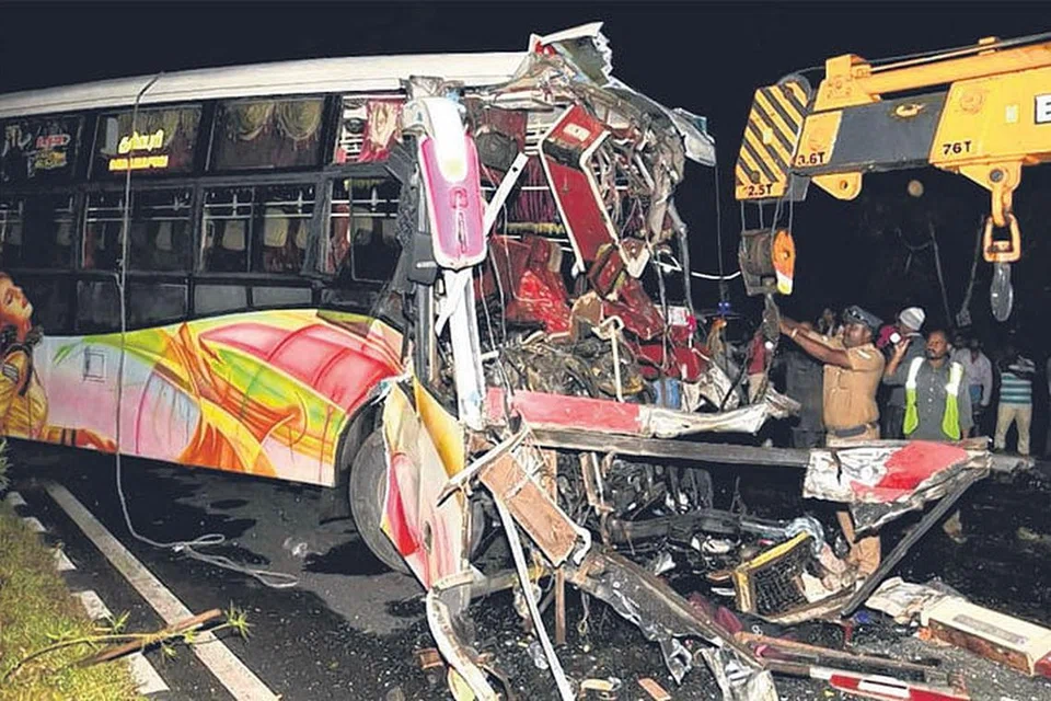 லாரிக்கு மிக அருகில் சென்ற பின்னரே அதைக் கவனித்த பேருந்து ஓட்டுநர், அதன் மீது இடிக்காமல் இருக்க பேருந்தைத் திருப்ப முயன்றார். இருந்தாலும், லாரி மீது இடித்த அந்தப் பேருந்து, நிற்காமல் சாலை நடுவே இருந்த தடுப்புகளை உடைத்து எதிர்த் திசையில் சென்றது. அதனால் அவ்வழியே வந்து கொண்டிருந்த சொகுசுப் பேருந்து மீது அது மோதியது. திடீரென ஏற்பட்ட மோதலால் பெங்களூரில் இருந்து கேரளாவின் திருவல்லா நோக்கிச் சென்ற சொகுசுப் பேருந்து தலைக்குப்புறக் கவிழ்ந் தது. இதில் அப்பேருந்தில் பயணம் செய்த எழுவர் சம்பவ இடத்திலேயே மாண்டனர்.