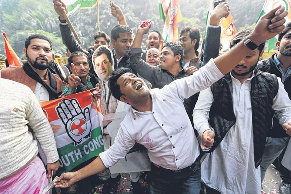 புதுடெல்லியில் உள்ள காங்கிரஸ் தலைமை அலுவலகத்தில் அக்கட்சியின் தொண்டர்கள் மகிழ்ச்சி ஆரவாரத்துடன் காங்கிரசின் வெற்றியைக் கொண்டாடுகின்றனர். படம்: ராய்ட்டர்ஸ்