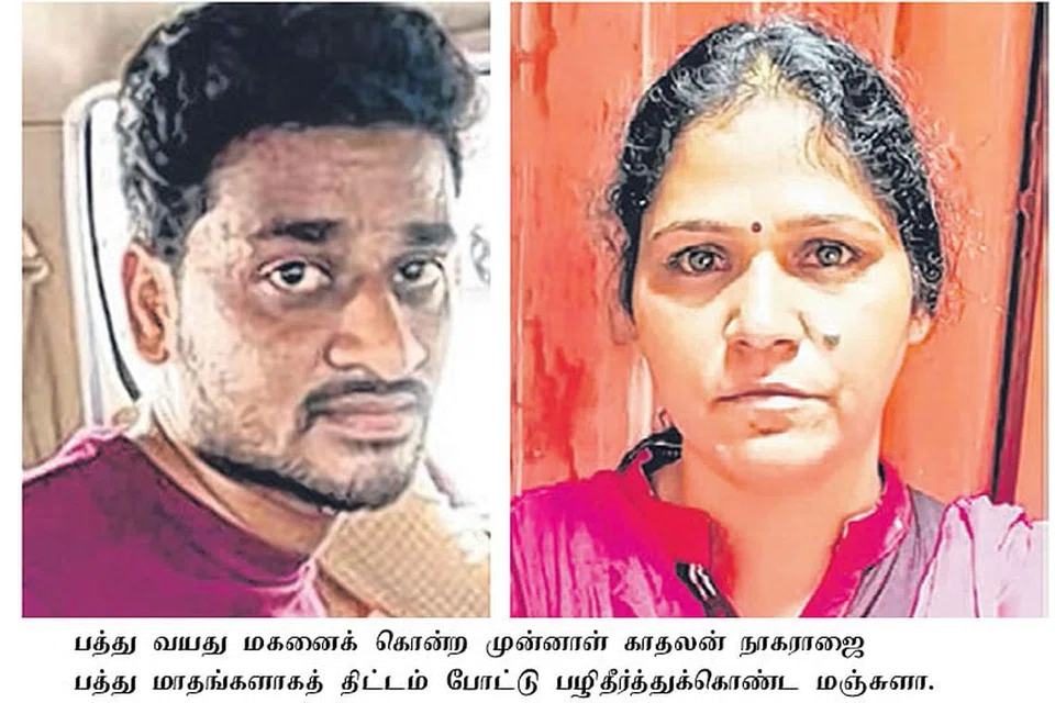 இது குறித்து தமது தந்தை கார்த்திகேயனிடம் சிறுவன் ரித் தேஷ் கூறிவிட மஞ்சுளாவை கண வன் கார்த்திகேயன் கண்டித்துள் ளார். இதனையடுத்து, தம்முடன் பேசுவதை மஞ்சுளா நிறுத்தியதால் ஆத்திரமடைந்த நாகராஜ், சிறுவன் ரித்தேஷை கடத்திச் சென்று கொடூர மாகக் கொலை செய்துவிட்டார். இந்தக் கெலை வழக்கில் கடந்த மார்ச் மாதம் சிறை சென்ற நாகராஜ், 9 மாதங்கள் கழித்து பிணையில் வெளியே வந்தார்.